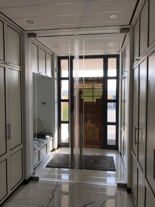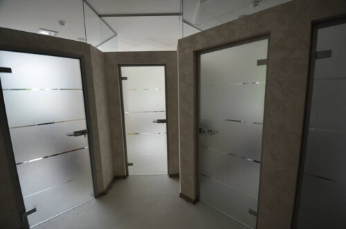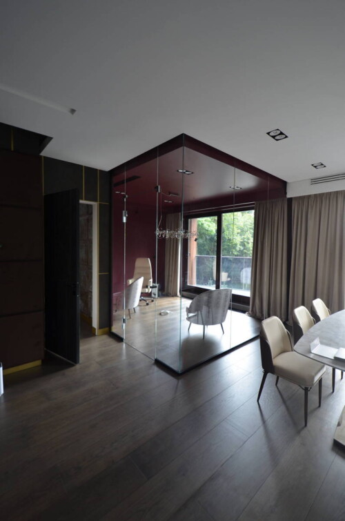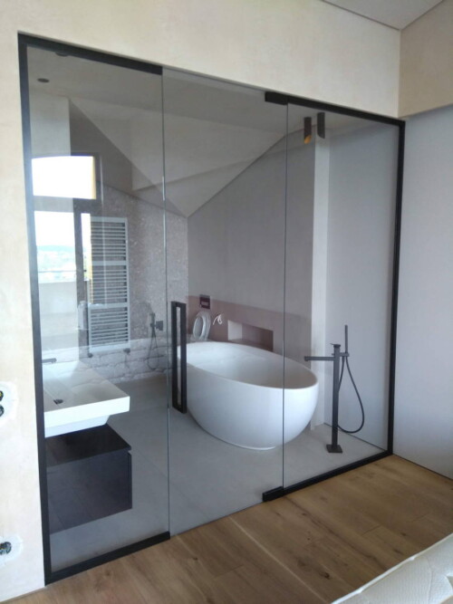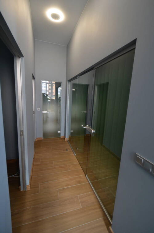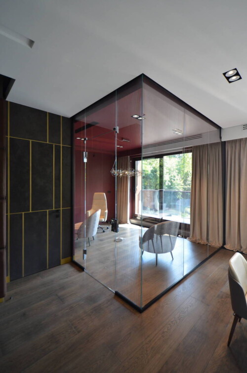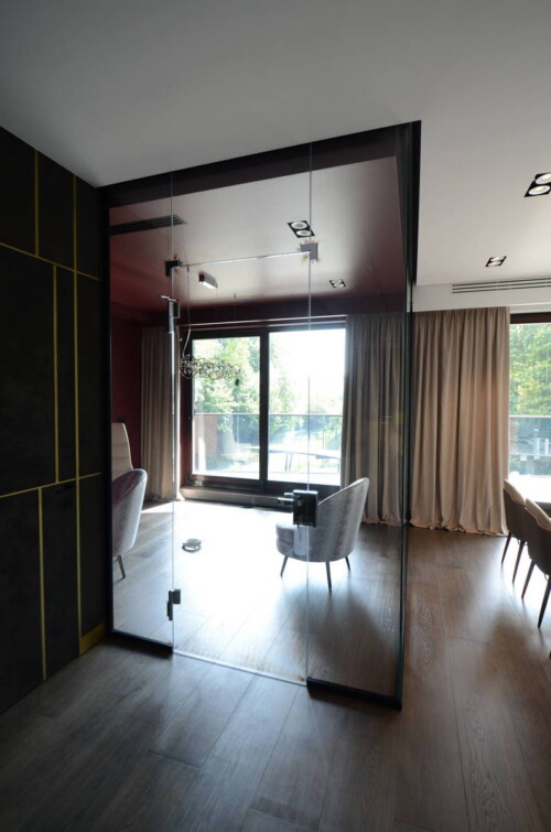- Офіси та студії — скло забезпечує візуальну відкритість, зберігаючи поділ на зони. Розсувні скляні двері — ідеальний варіант для створення комфортного робочого середовища, яке сприяє продуктивності та одночасно зберігає відчуття простору.