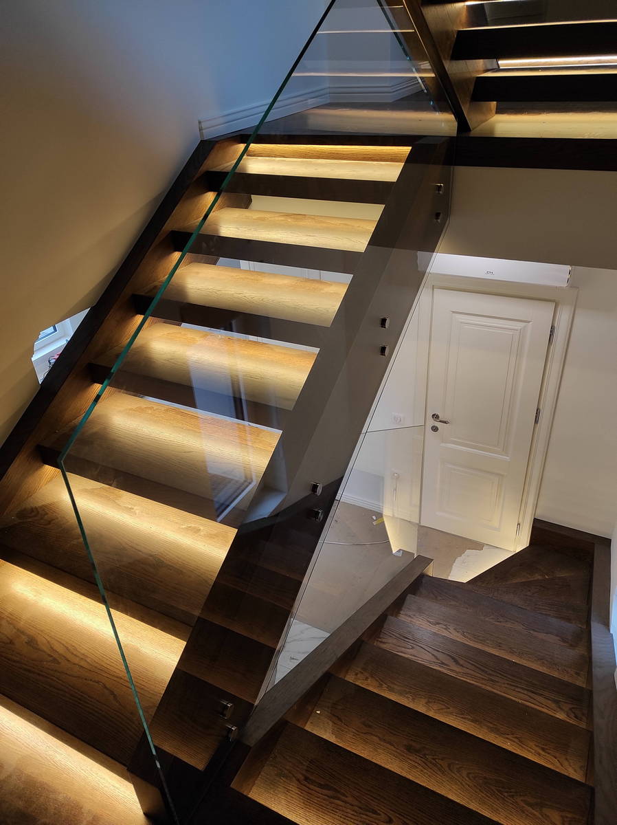 - Безпека без компромісів. Завдяки використанню загартованого або триплекс-скла, такі поручні є міцними та безпечними. Це особливо актуально для будинків із дітьми, адже скло не має гострих кутів або проміжків, у які можна застрягти.