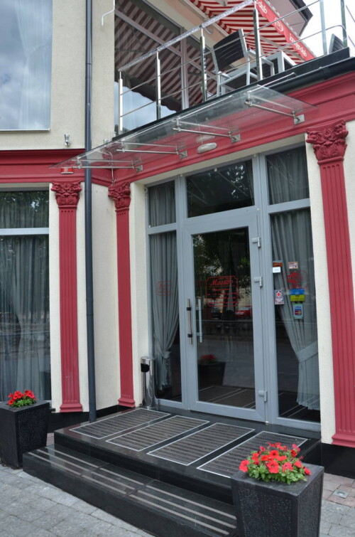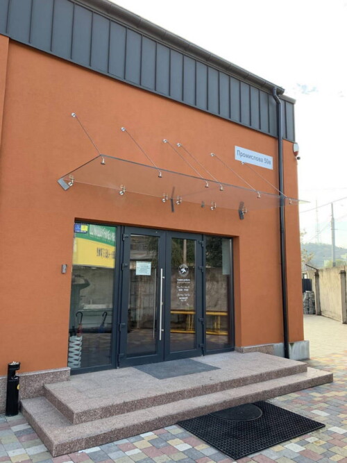 Завдяки прозорості скла фасад залишається візуально відкритим і легким, не втрачаючи при цьому функціональності. Такий козирок ефективно захищає від дощу й снігу, додає архітектурної елегантності та підкреслює сучасний стиль закладу.