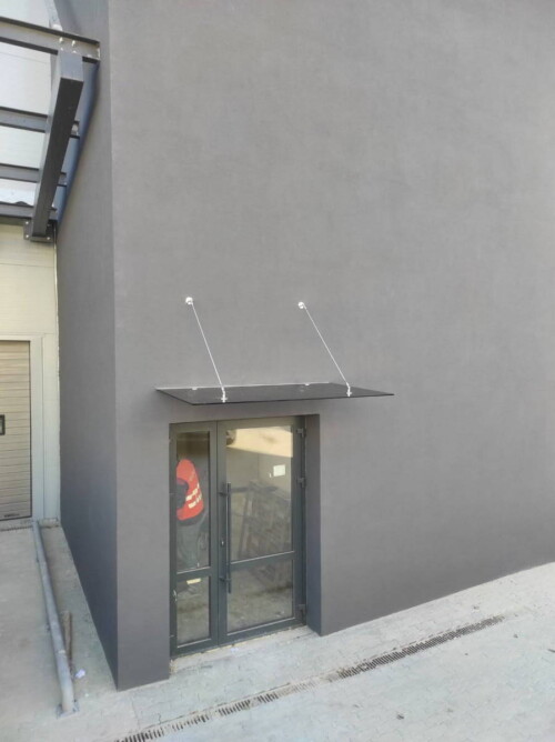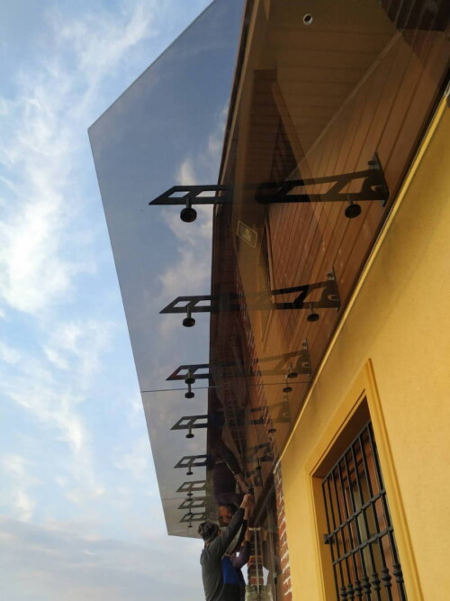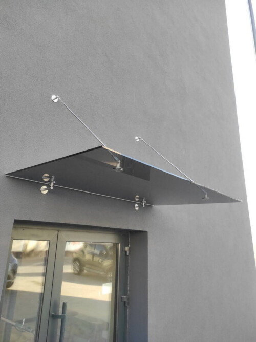 Для козирка найчастіше використовують гартоване скло — міцне, стійке до механічних пошкоджень і температурних перепадів. Альтернативою може бути триплекс — багатошарове ламіноване скло з високим рівнем безпеки. Такий варіант — це і захист, і вишуканий акцент для будь-якого комерційного фасаду.